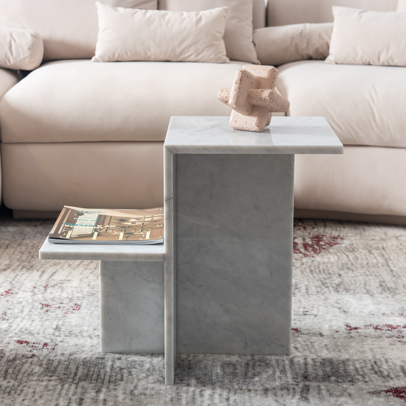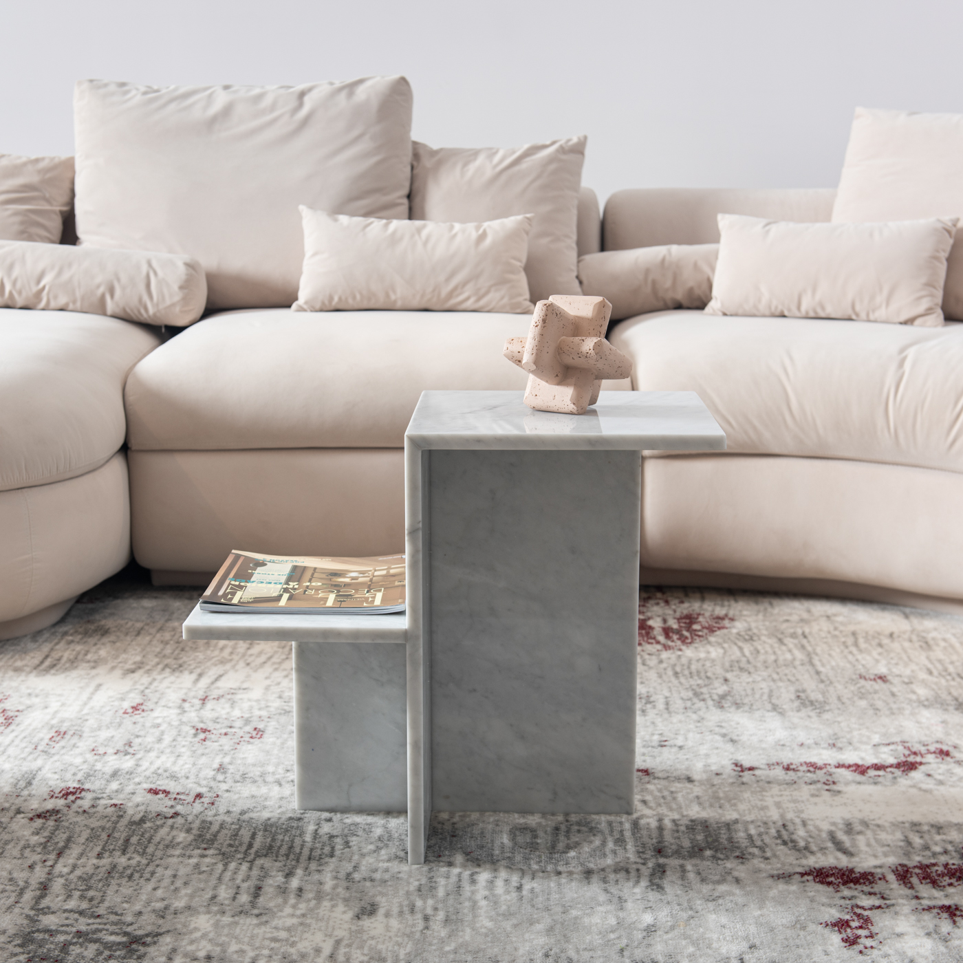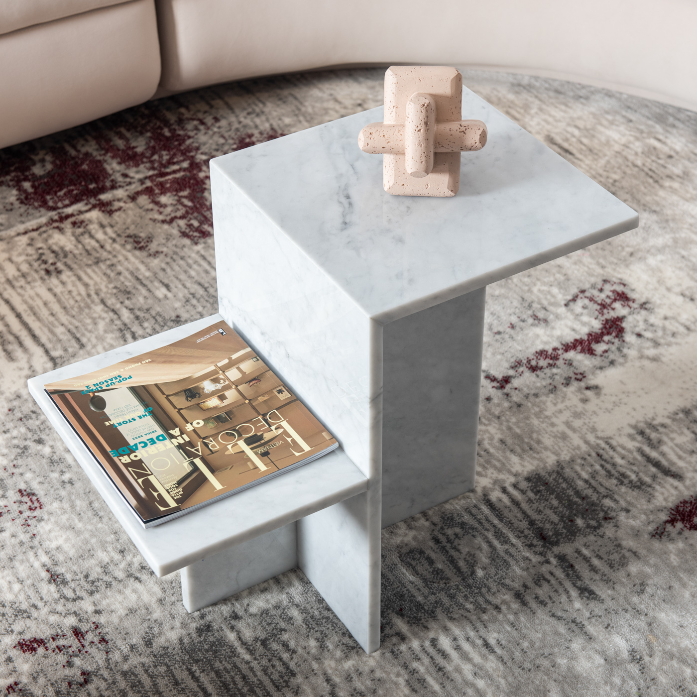 Bàn trà Zeno được chế tác hoàn toàn từ đá marble tự nhiên, mang tông màu nâu nhạt ấm áp cùng các đường vân tinh tế, tạo điểm nhấn sang trọng và đẳng cấp cho không gian phòng khách.